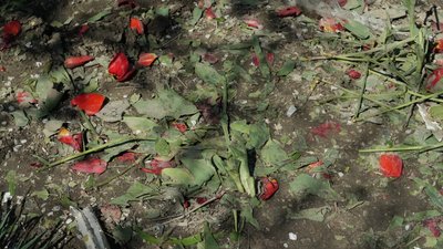 Поламані квіти тюльпанів поблизу місця обстрілу. Наслідки авіаудару РФ по Комишувасі вранці 23 квітня 2026 року. Суспільне Запоріжжя