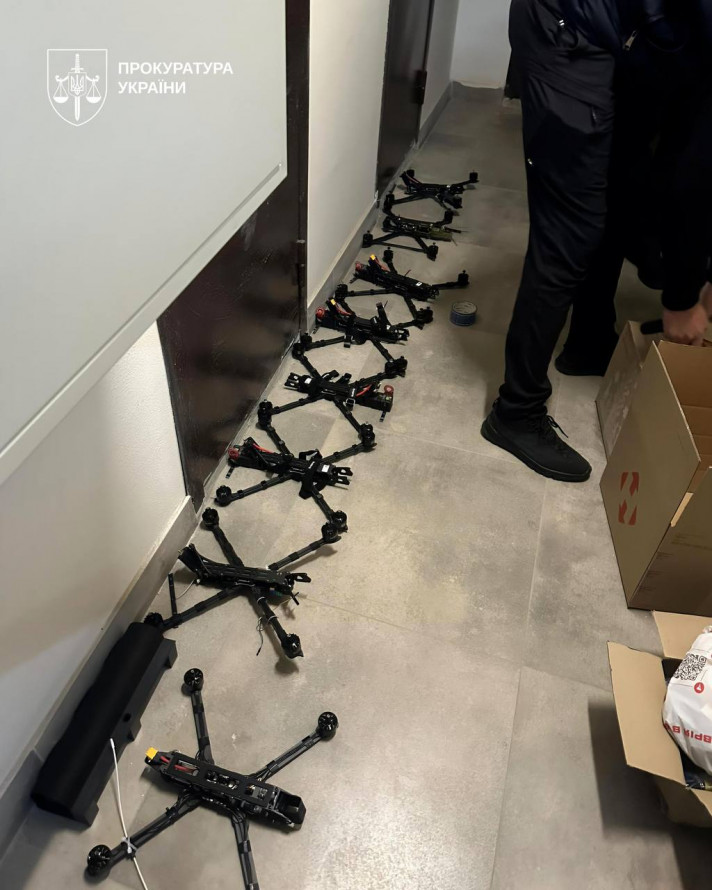 Під час обшуків правоохоронці вилучили квадрокоптери DJI Matrice 4T та DJI Mavic 4 Pro, комплектуючі й документацію, а також пакування із серійними номерами.