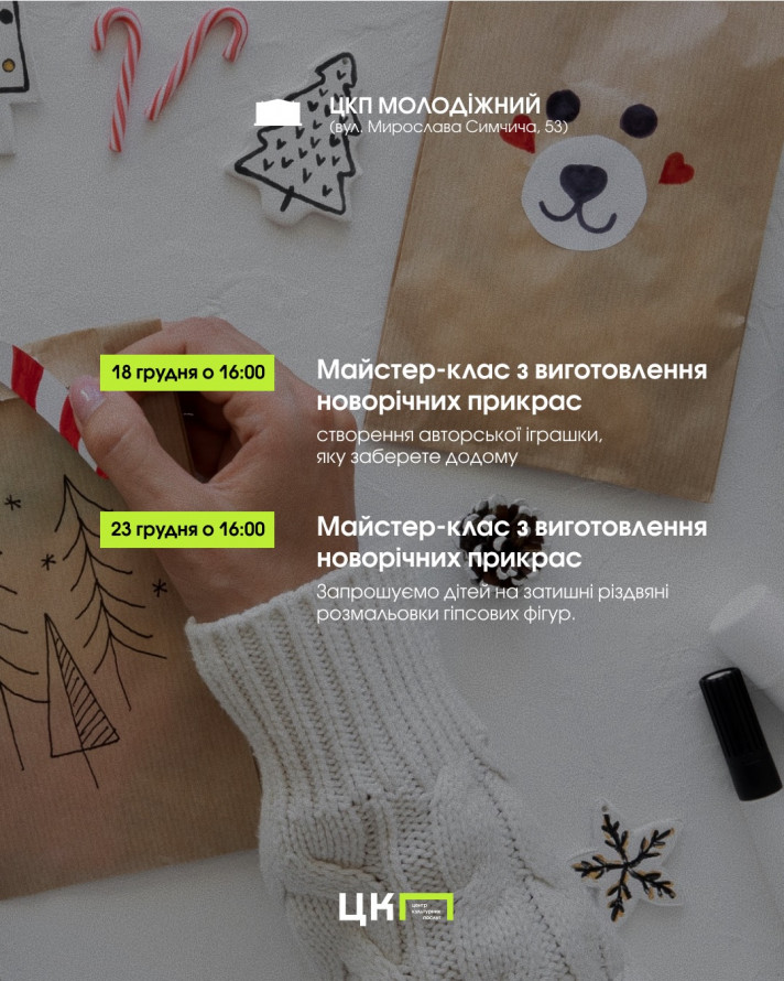 — 20 грудня о 14.00 — майстер-клас «Різдвяна майстерня» (для дітей 7-16 років), ІІ укриття ЦКП «Орбіта» (вул. Вячеслава Зайцева, 9).