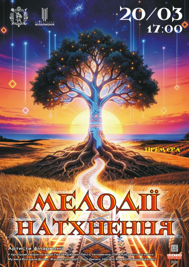 — 20 березня о 17.00 — прем’єра концерту «Мелодії натхнення».У центрі програми — «золотий фонд» української культури: поетичне слово Лесі Українки та Ліни Костенко, вишукана музика Богдани Фільц, Жанни Колодуб, Лесі Дичко, запорізьких композиторок — заслуженого діяча мистецтв України Наталії Боєвої, Ганни Хазової та інших.