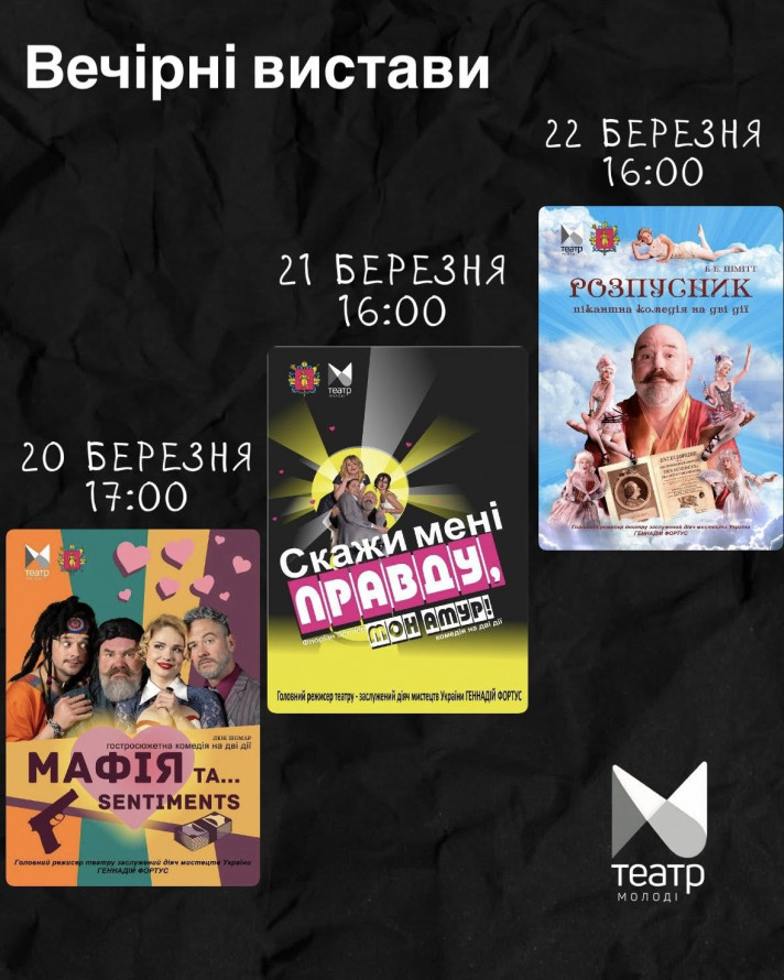 — 20 березня о 17.30 — вистава «МЖМ: Мрію. Жадаю. Можу», 18+. У ЦКП «Орбіта»