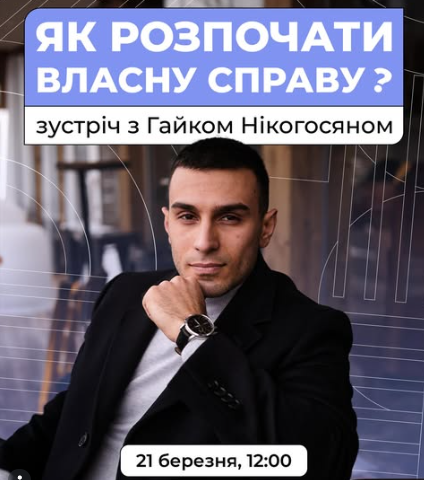 — 21 березня о 12.00 — зустріч «Як розпочати власну справу». Спікер — власник мережі «Сендвіч Маркет» Гайк Нікогосян.