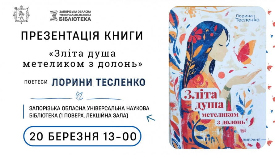 — 20 березня о 13.00 — презентація поетичної книги «Зліта душа метеликом з долонь» членкині Національної спілки письменників України, керівниці Запорізького літературно-художнього об’єднання «Пошук» імені Лиходіда Лорини Тесленко. Авторка долучиться до зустрічі онлайн у Zoom.