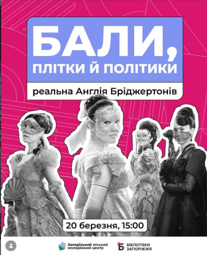 — 20 березня о 15.00 — лекція-дискусія «Бали, плітки й політики: реальна Англія Бріджертонів».