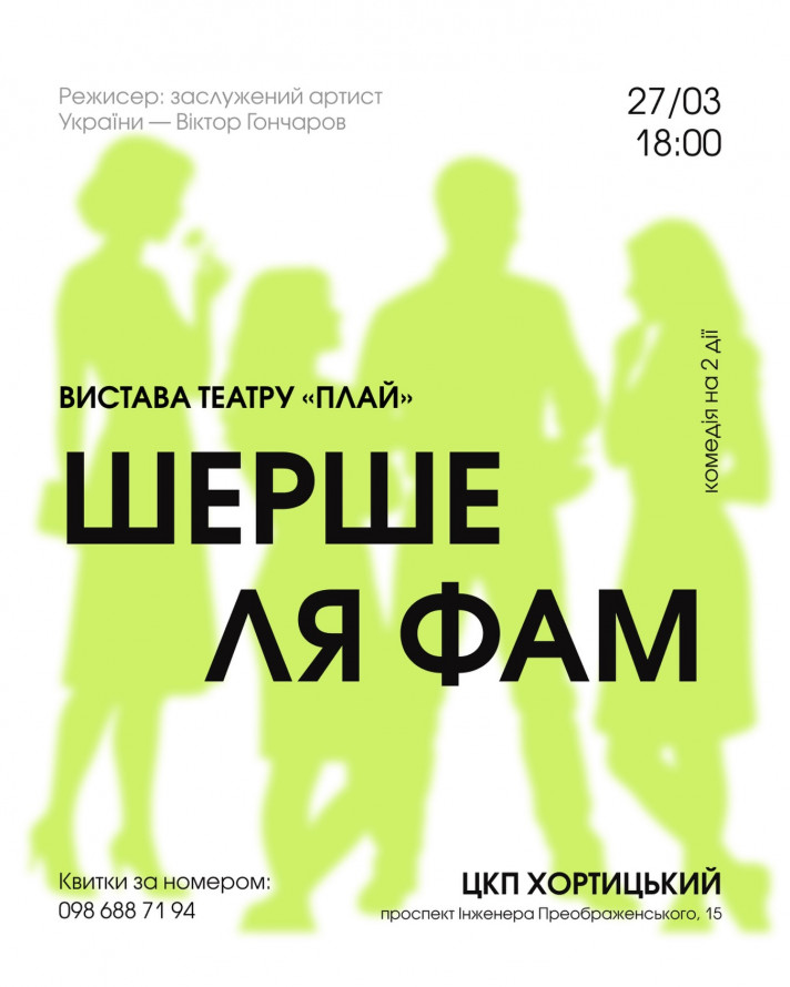 — 27 березня о 18.00 — прем’єра комедії «Шерше ля фам», режисер — заслужений артист України Віктор Гончаров.