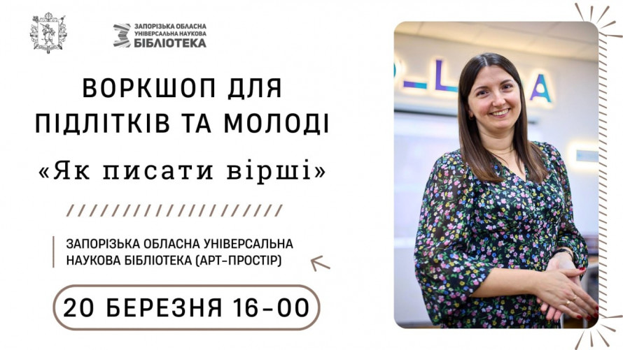 — 20 березня о 16.00 — воркшоп «Як писати вірші» від поетеси, засновниці проєкту «Літературна штольня» Олени Ольшанської. Для молоді 14-20 років.