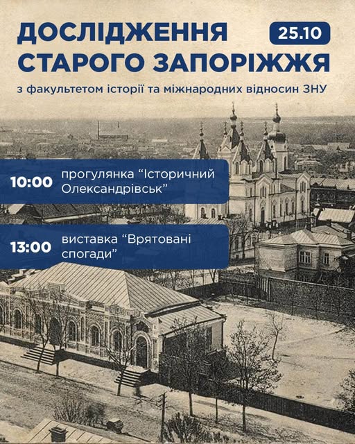 У Запоріжжі відбудеться серія подій, присвячених історії та культурі міста. 25 жовтня факультет історії та міжнародних відносин Запорізького національного університету запрошує містян на екскурсію та виставку-презентацію.