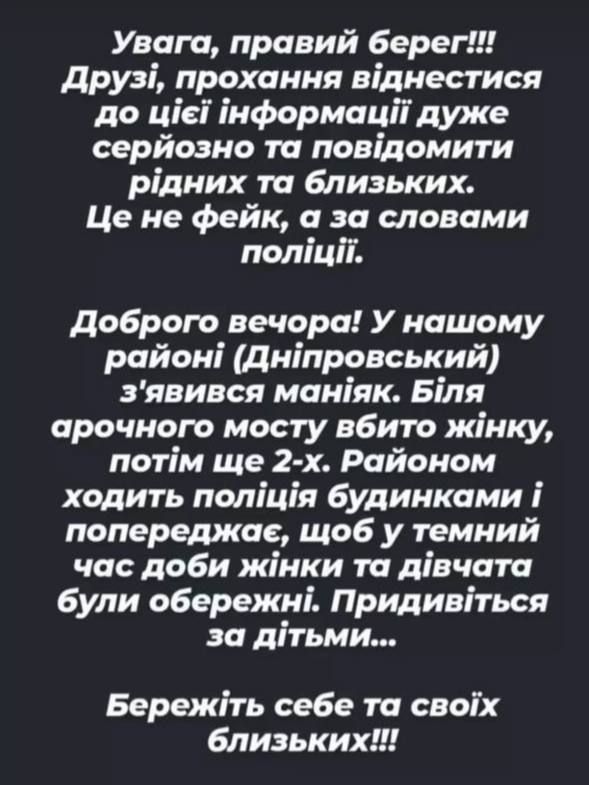 «Боже, яке в нас веселе місто: вибухи, війна, тепер манʼяк… Краще перебдіти, ніж недобдіти», — пишуть користувачі соцмереж.