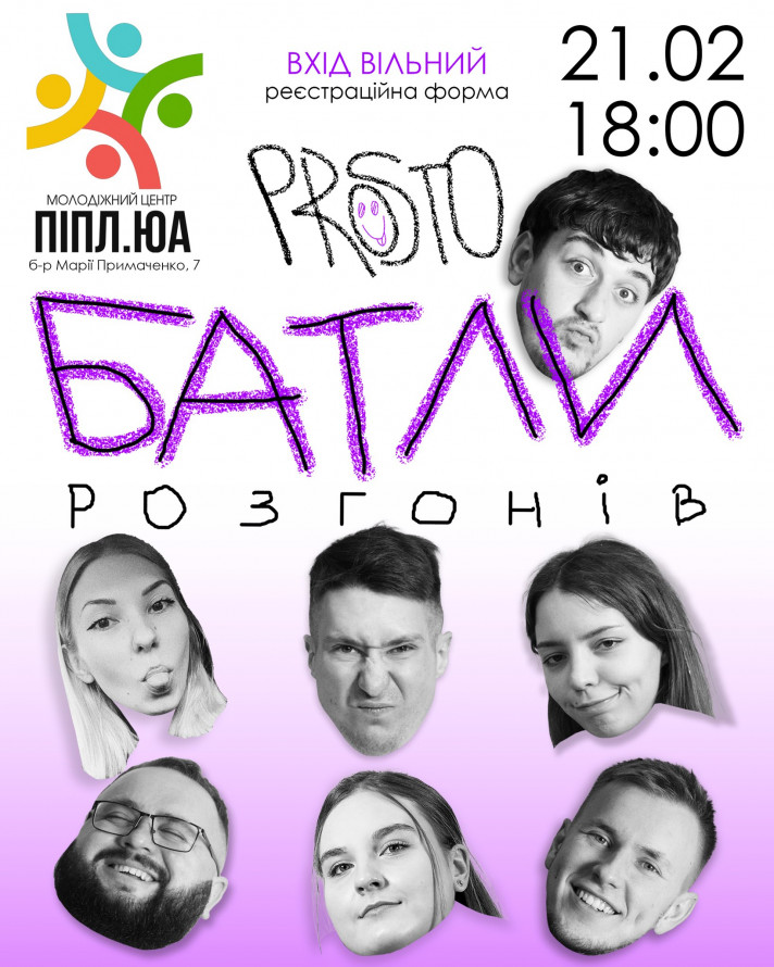 — 21 лютого о 18.00 — «Батли розгонів», імпровізаційне шоу, де теми вигадує зал, у молодіжному центрі «Піпл.юа» (вул. Марії Приймаченко, 7).