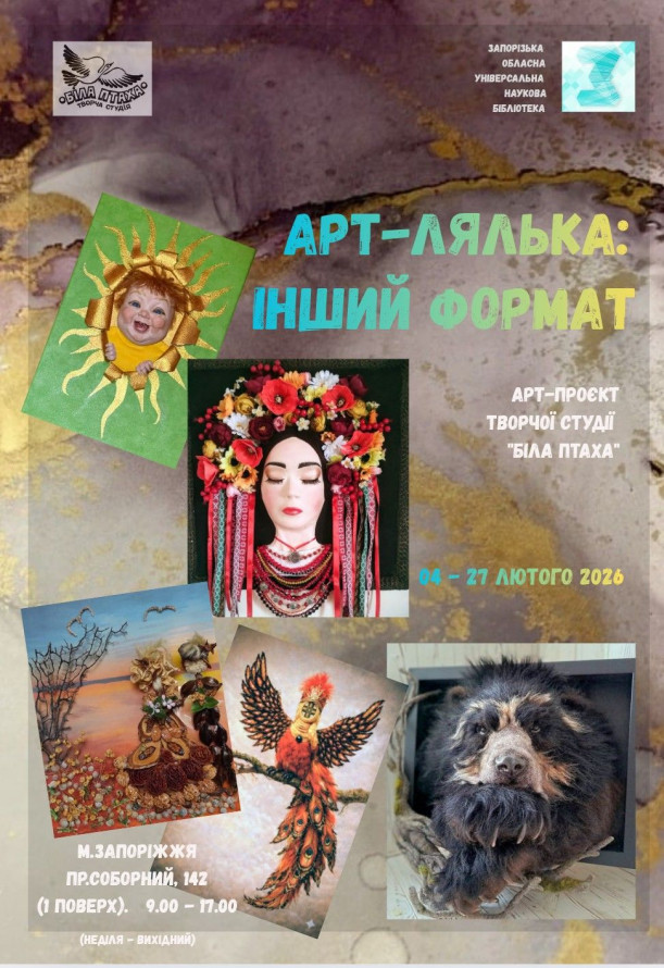 Виставка «Арт-Лялька: Інший Формат» майстрів авторської ляльки творчої студії «Біла птаха» (Запоріжжя) — до 27 лютого.