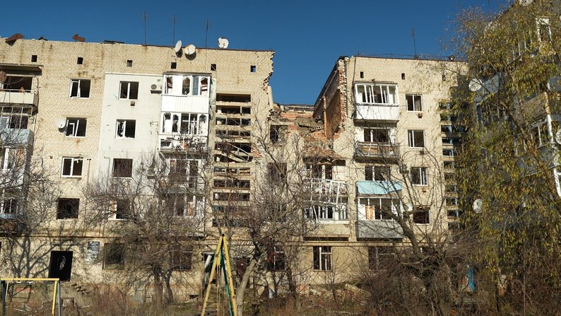 Зруйнована російськими обстрілами будівля у прифронтовому Оріхові на Запоріжжі, 25 листопада 2025 року. Максим Савчук/Суспільне Запоріжжя