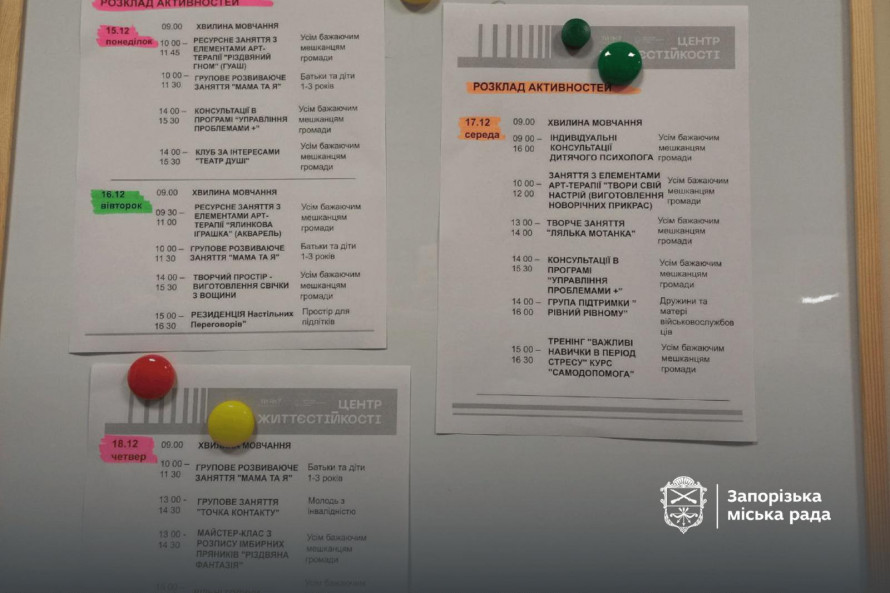 У червні цього року у Запоріжжі відкрили перший у місті Центр життєстійкості. Це безпечний та безбар’єрний простір, де мешканці громади можуть отримати психологічну підтримку, консультації соціальних працівників та взяти участь у різноманітних групових заняттях. Про це повідомляється на сайті Запорізької міської ради.