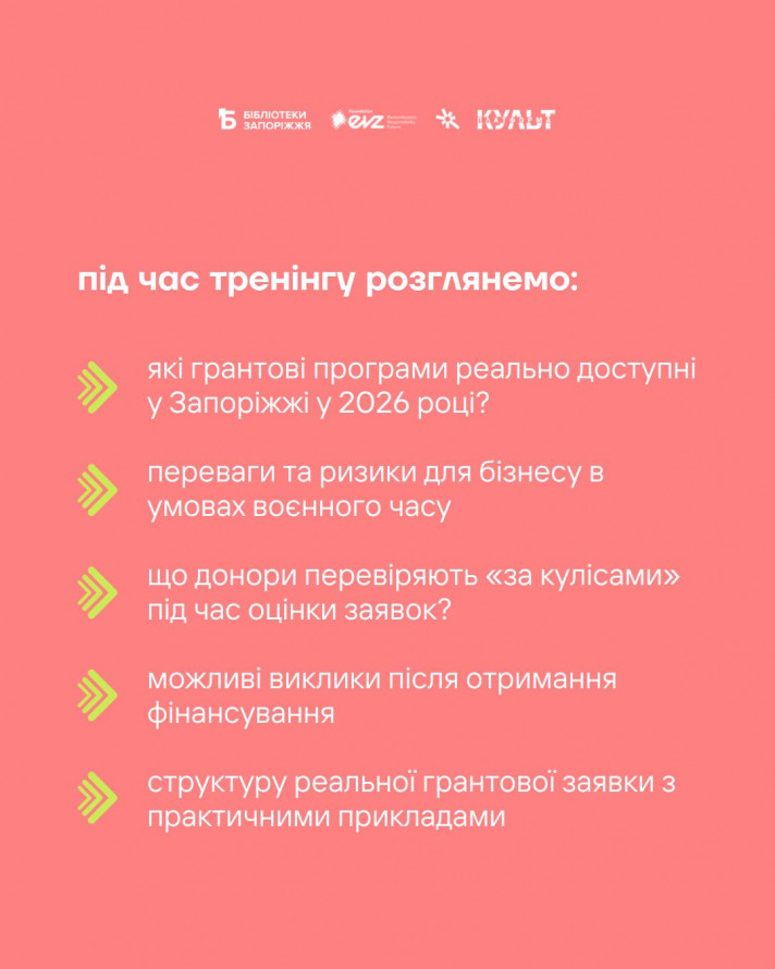 Вік: дорослі. Зустріч буде корисною для підприємців, які розглядають грант як інструмент розвитку, але хочуть тверезо оцінити можливості та ризики роботи в умовах прифронтового регіону.