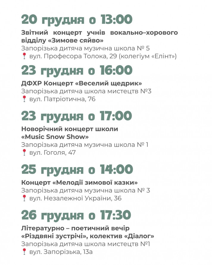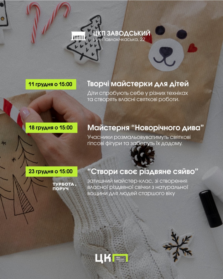 — 23 грудня — святкові майстерки у ЦКП «Заводський» та ЦКП «Молодіжний». Вхід вільний. Деталі за датами й часом — на картках нижче.