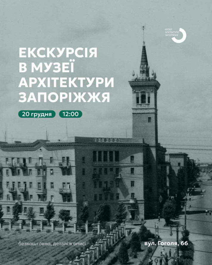 — 20 грудня о 12:00 — екскурсія «Запоріжжя архітектурне» у Музеї архітектури Запоріжжя. Безкоштовно, за попередньою реєстрацію (як зареєструватись читайте нижче).