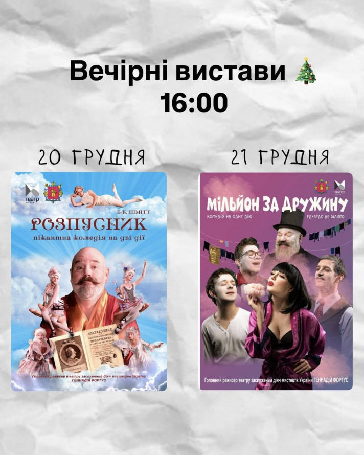 — 23, 24, 25, 26 грудня, 2, 6, 7, 8, 10, 11 січня о 10.00 — прем’єра дитяча новорічно-різдвяної вистави “Казка засніженого лісу”.