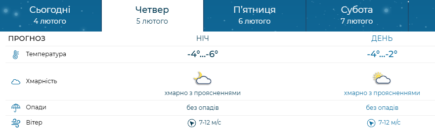 Температурний фон залишиться приблизно на тому ж рівні: вночі -6…-4°, удень -4…-2°. Хмарно з проясненнями, без опадів. Вітер 7-12 м/с додаватиме відчуття прохолоди, але загалом погода буде більш комфортною порівняно з попередніми морозними днями.