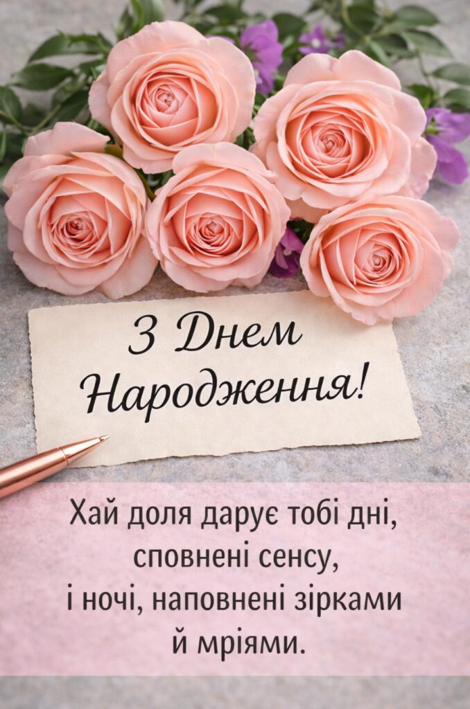 З днем народження! Нехай сьогодні для тебе звучать найтепліші слова, а попереду буде багато подій, які змусять посміхатися. Бажаю сили, удачі, вірних друзів, щирих емоцій та надихаючих можливостей. Нехай щастя стане твоїм постійним супутником.