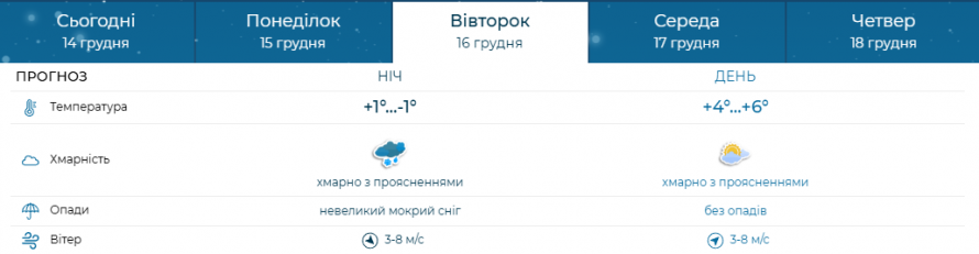 У нічні години температура повітря коливатиметься в межах від +1 до -1 градуса. Очікується хмарна погода, можливий невеликий мокрий сніг. Вітер — 5–10 м/с. Удень повітря прогріється до +2…+4 градусів, збережеться хмарність, подекуди можливий мокрий сніг із дощем.