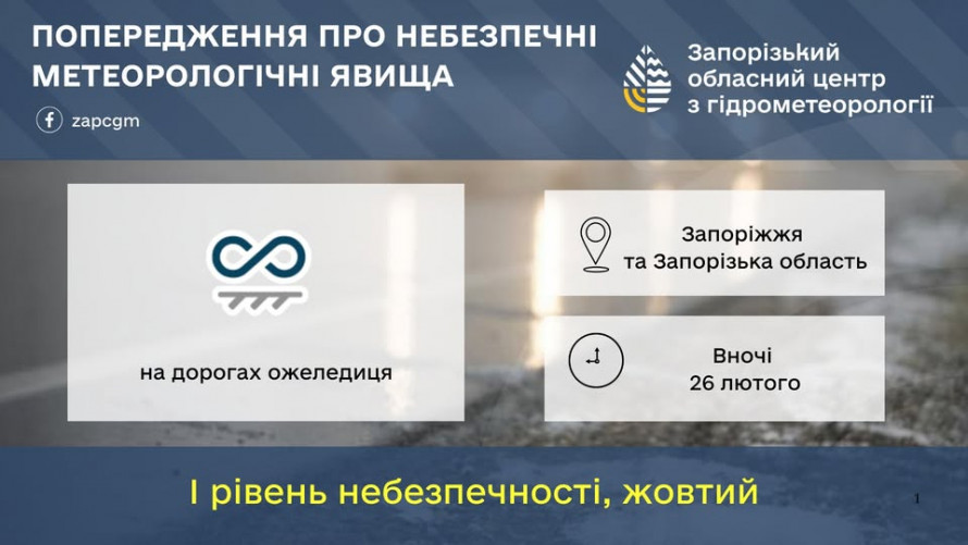 Вночі 26 лютого на дорогах очікується ожеледиця — оголошено І рівень небезпечності, жовтий. Такі погодні умови можуть призвести до збільшення гальмового шляху, заносу автомобілів, втрати маневрування та зростання ризику ДТП.