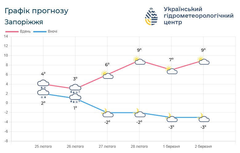 Натомість у п’ятницю, 27 лютого, ситуація зміниться. Вранці над Запоріжжям розпогодиться: досвіткові хмари відступлять, і до кінця дня істотних опадів не прогнозують. Вночі очікується -1°…-3°C за північного вітру 3–8 м/с. На дорогах місцями можлива залишкова слизькість через нічне підмерзання.