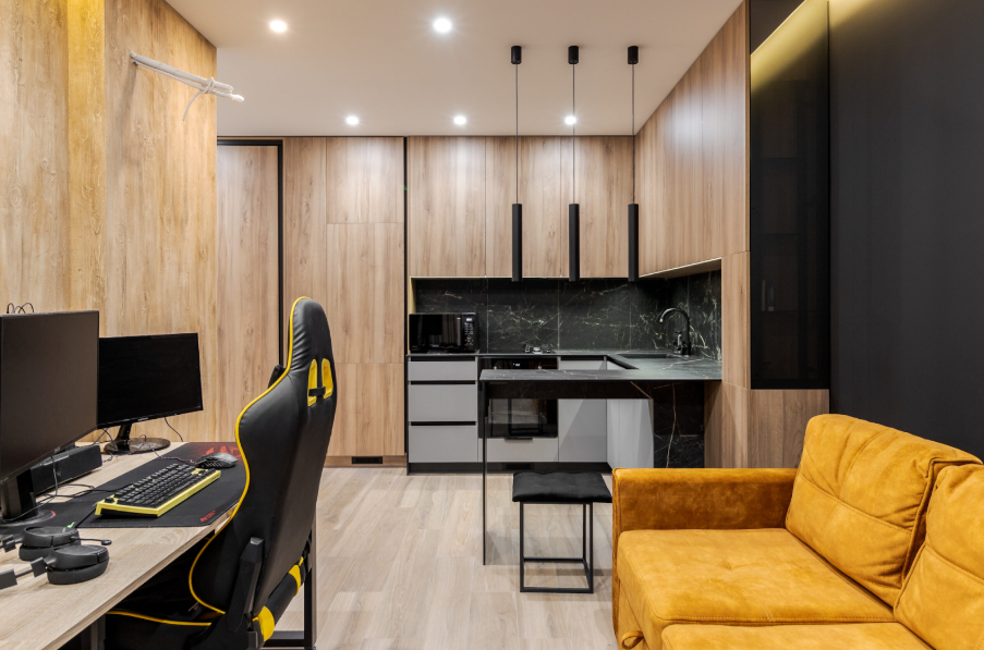 Також варто уникати розміщення робочого місця поряд із ліжком, адже це погіршує концентрацію та сприяє швидкому вигоранню. Кут кімнати або зона біля книжкової полиці — хороші варіанти для організації навчання або віддаленої роботи. Якщо квартира має нішу або комору — її можна переобладнати у мінікабінет, обладнавши додатковим освітленням та полицями.
