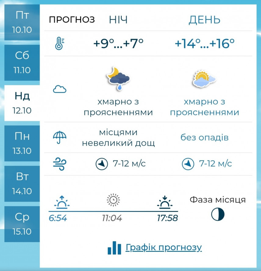 У неділю, 12 жовтня, хмарність чергуватиметься з проясненнями. Вночі +7…+9°C, невеликий дощ, а вдень без опадів — +14…+16°C. Вітер північно-західний, помірний.