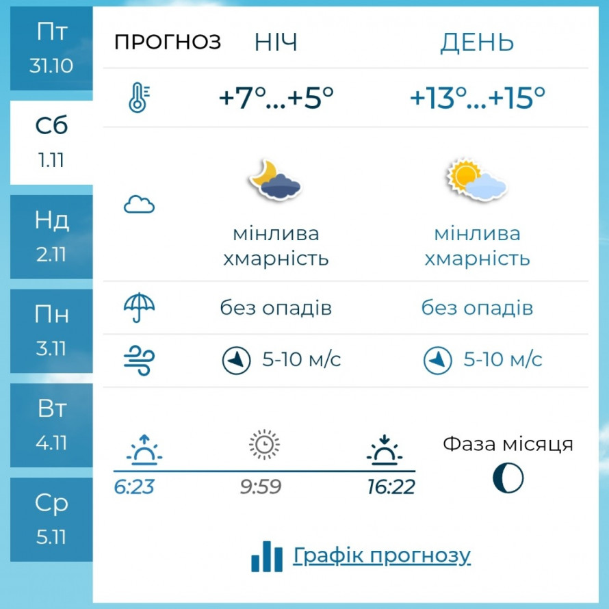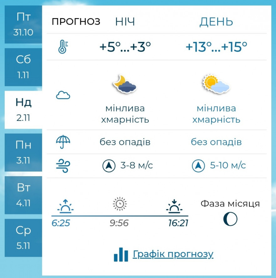 Північно-західний вітер дутиме зі швидкістю 5-10 м/с, проте він не принесе дощової прохолоди. Денні години порадують ще більшим теплом – повітря прогріється до +13°…+15°C, а мінлива хмарність дозволить сонцю періодично радувати містян своїм промінням.