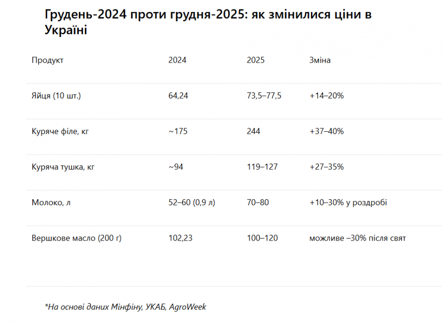 Найпомітніше зросли в ціні яйця та курятина. Сегмент молочних продуктів поводиться значно нестабільніше: супермаркети пропонують знижки, але передсвятковий попит у грудні традиційно підштовхує вартість вгору — на 1,5–7%.