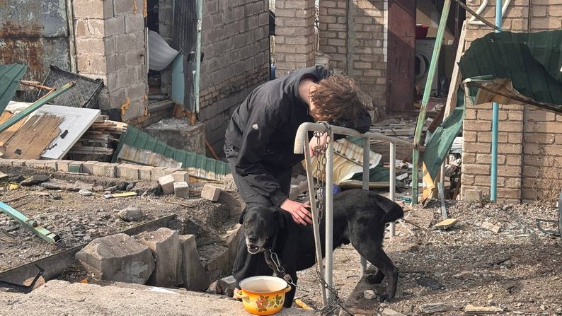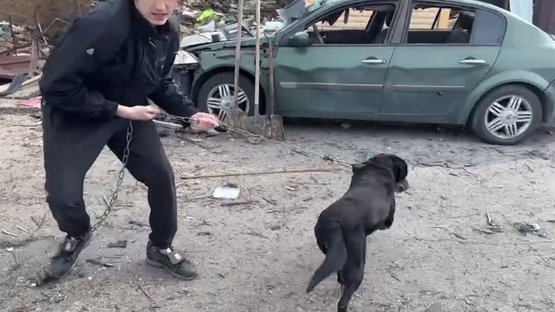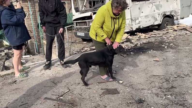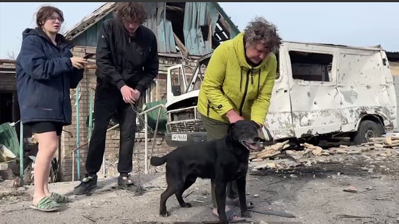 Не відходить від місця трагедії собака родини. Він дивиться на згарище, виє та рветься з повідця. Його ледь стримують люди: він тягне сильно, намагаючись бігти.