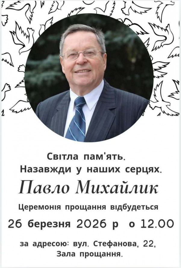 Прощання з Павлом Андрійовичем Михайликом відбудеться у четвер 26 березня 2026 року о 12.00 за адресою: Запоріжжя, вул. Стефанова 22, «Зала прощання».