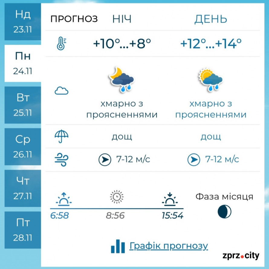 Понеділок, 24 листопада, розпочнеться з похмурого неба та дощів. Найактивніша фаза опадів припадає на ранкові години, коли дощ набере максимальної сили. Протягом дня інтенсивність зменшиться, а ближче до вечора опади повністю припиняться, залишивши місто під густою хмарною ковдрою.