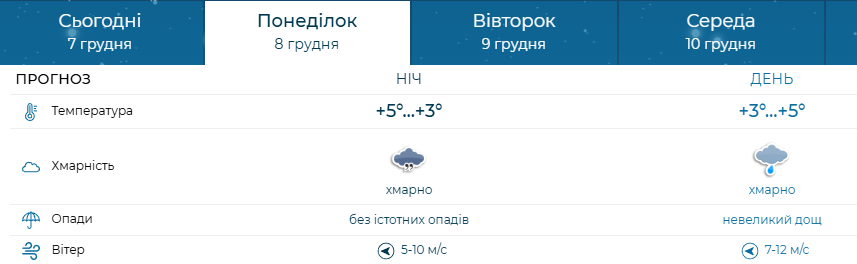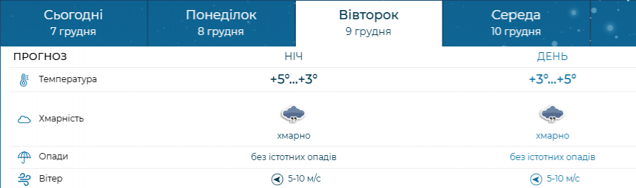 У вівторок, 9 грудня, температурний фон не зміниться. Також упродовж дня зберігатиметься хмарність, проте дощів не прогнозують. Вітер східний, 5-10 м/с.