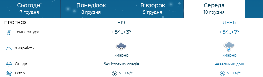 У середу, 10 грудня, буде трохи тепліше: від +5 до +7. Очікується невеликий дощ та хмарність. Вітер північно-західний, 5-10 м/с.