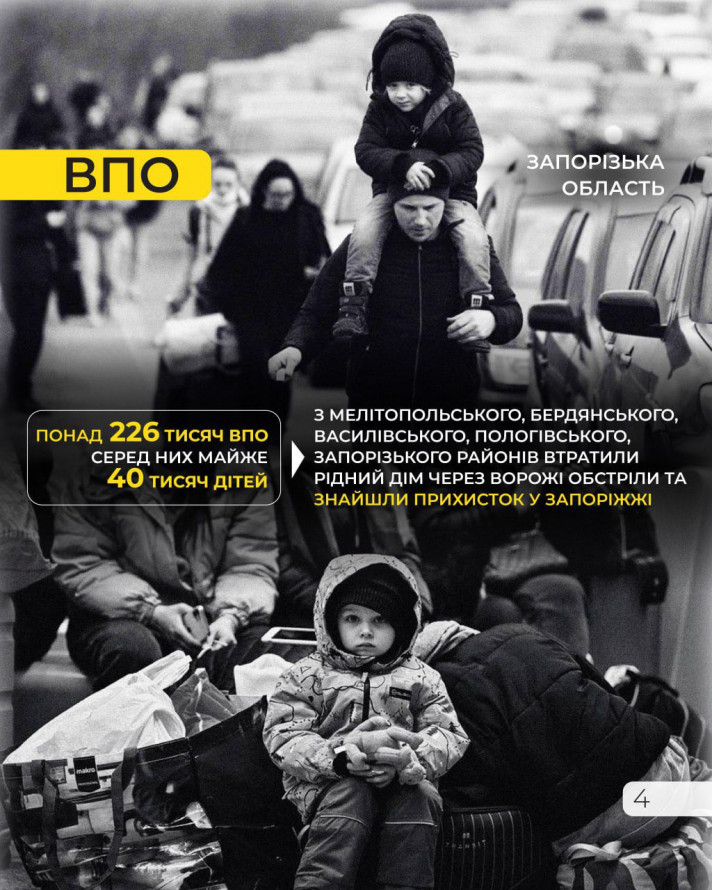 Понад 226 тисяч ВПО, серед них майже 40 тисяч дітей, з Мелітопольського, Бердянського, Василівського, Пологівського, Запорізького районів втратили рідний дім через ворожі обстріли та знайшли прихисток у Запоріжжі.