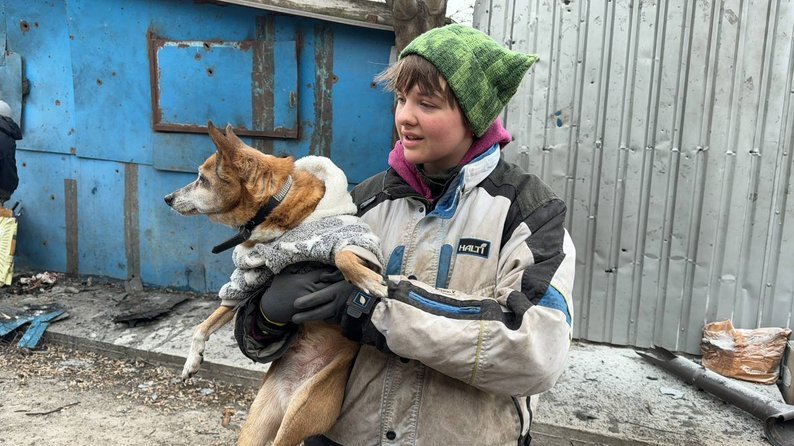 Працівниця притулку із собакою після обстрілу РФ по Запоріжжю, 6 лютого 2026 року. Суспільне Запоріжжя