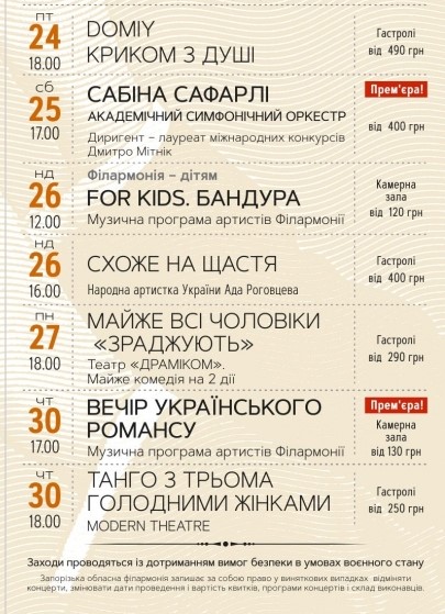 «Філармонійний тиждень для наших незламних глядачів. Три прем’єри та вечір неймовірних українських романсів у виконанні улюблених артистів і юних зірочок у затишній Запорізькій філармонії!