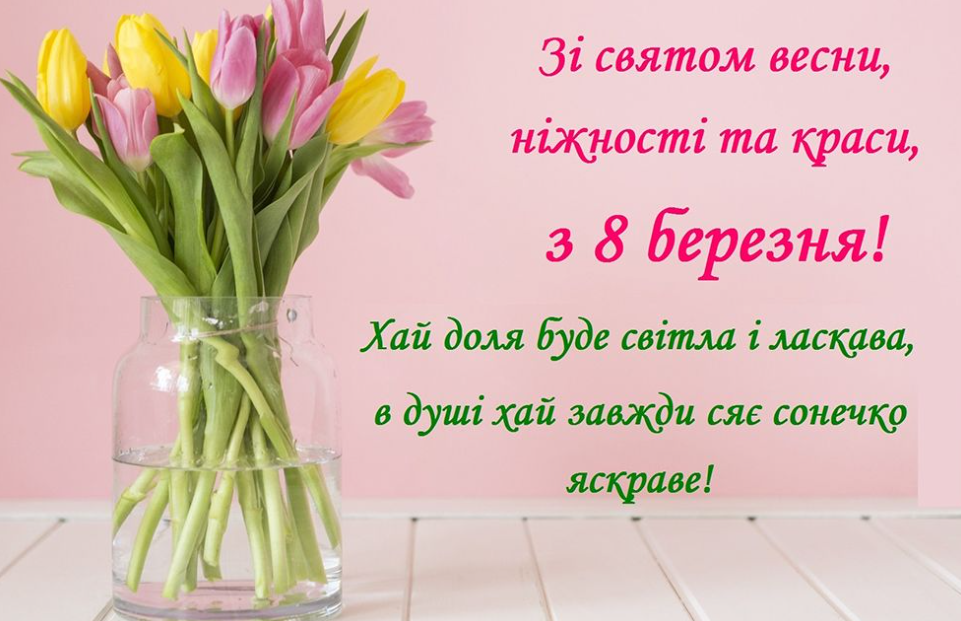 Щиро вітаю вас, прекрасні дами, з Міжнародним Жіночим Днем! Нехай весняна атмосфера додасть вам енергії, життєрадісності, успішності та впевненості у власні сили Нехай кожен момент цього дня приносить вам тепло, затишок та найприємніші сюрпризи.