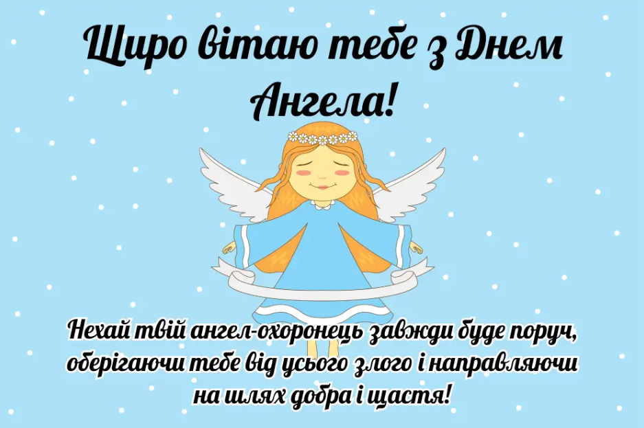 З Днем ангела! Нехай життя буде щедрим на добро, серце – на любов, а доля – на удачу. Бажаю, щоб твій ангел-охоронець завжди був поруч та допомагав у всіх починаннях. Міцного здоров’я, безмежного щастя та світлої радості!