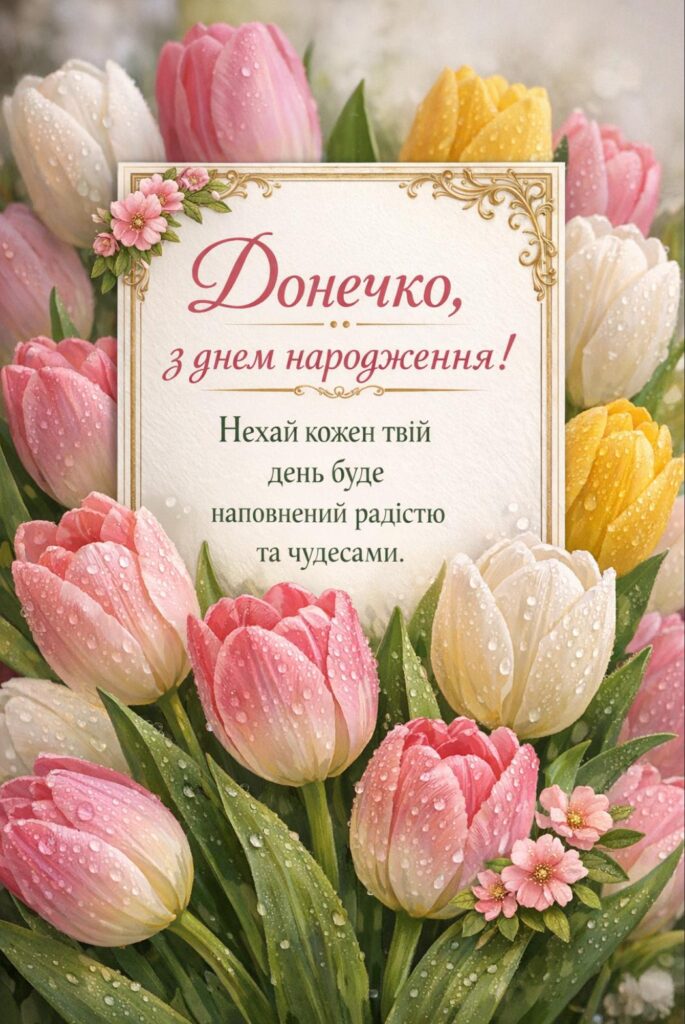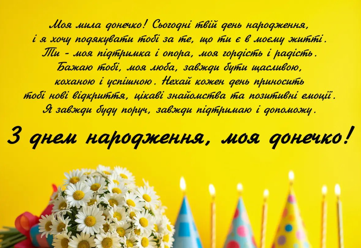 Моя дорога донечко, з Днем народження тебе! Бажаю, щоб кожен день дарував тобі тепло, ніжність і натхнення. Нехай поруч завжди будуть добрі та щирі люди, які підтримають у будь-яку хвилину. Здоров’я тобі міцного, здійснення найзаповітніших мрій і багато світлих миттєвостей. Пам’ятай, що для мене ти завжди залишишся найріднішою та найціннішою людиною у світі.