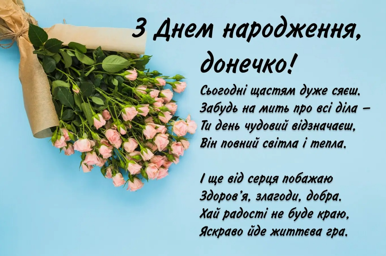 Моя люба донечко! Вітаю тебе з твоїм Днем народження! Ти знову стала на рік дорослішою, дуже красивою й самостійною. Бажаю тобі, моя рідна, міцного здоров’я, неземного щастя, благополуччя й неочікуваної удачі. Нехай твоє життя буде наповнене яскравими барвами, незабутніми відчуттями, чудовими спогадами й тільки позитивними емоціями. Бажаю тобі, моя донечко, бути бажаною і коханою, а також реалізуватись у житті й стати самодостатньою та успішною. Хай на твоєму життєвому шляху трапляються лише вірні друзі й добрі люди, а негоди, проблеми й труднощі минають стороною.