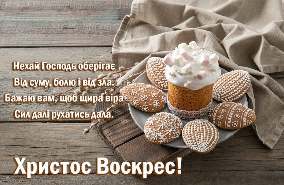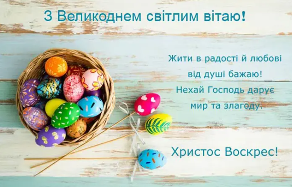 Христос Воскрес ми говоримо з надією і посмішкою. Бажаємо, щоб мир, добро з небес сьогодні зійшли. Здоров’я вам, радості, умиротворення, спокою у душі, святого натхнення, підтримки близьких, допомоги від друзів, всіх мирських благ і стола святкового, і віру в краще, в любов, в надію, удачу, та багато світлих днів. Зі святом Великодня!