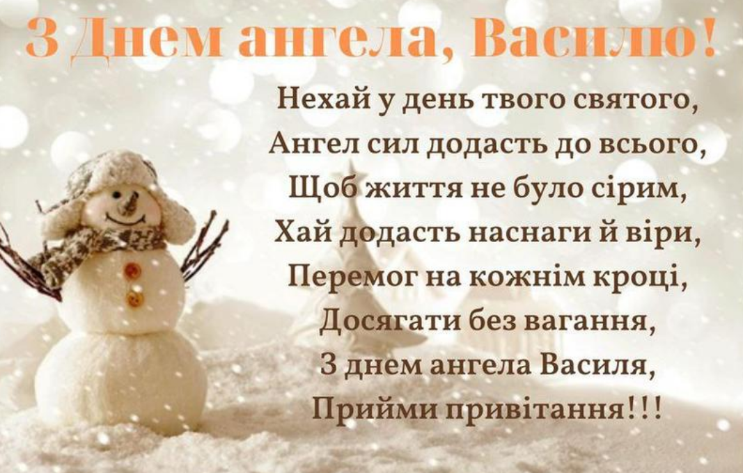 Вітаю тебе з Днем Ангела, бажаю щоб твій ангел завжди тебе оберігав, і направляв, а інколи і штовхав у спину для точності у виборі життєвого шляху. Щоб всі справи давались легко, Васильку, а всі негаразди ти зустрічав з оптимізмом та надією у серці. Нехай День дарує світло, адже це твоє свято!