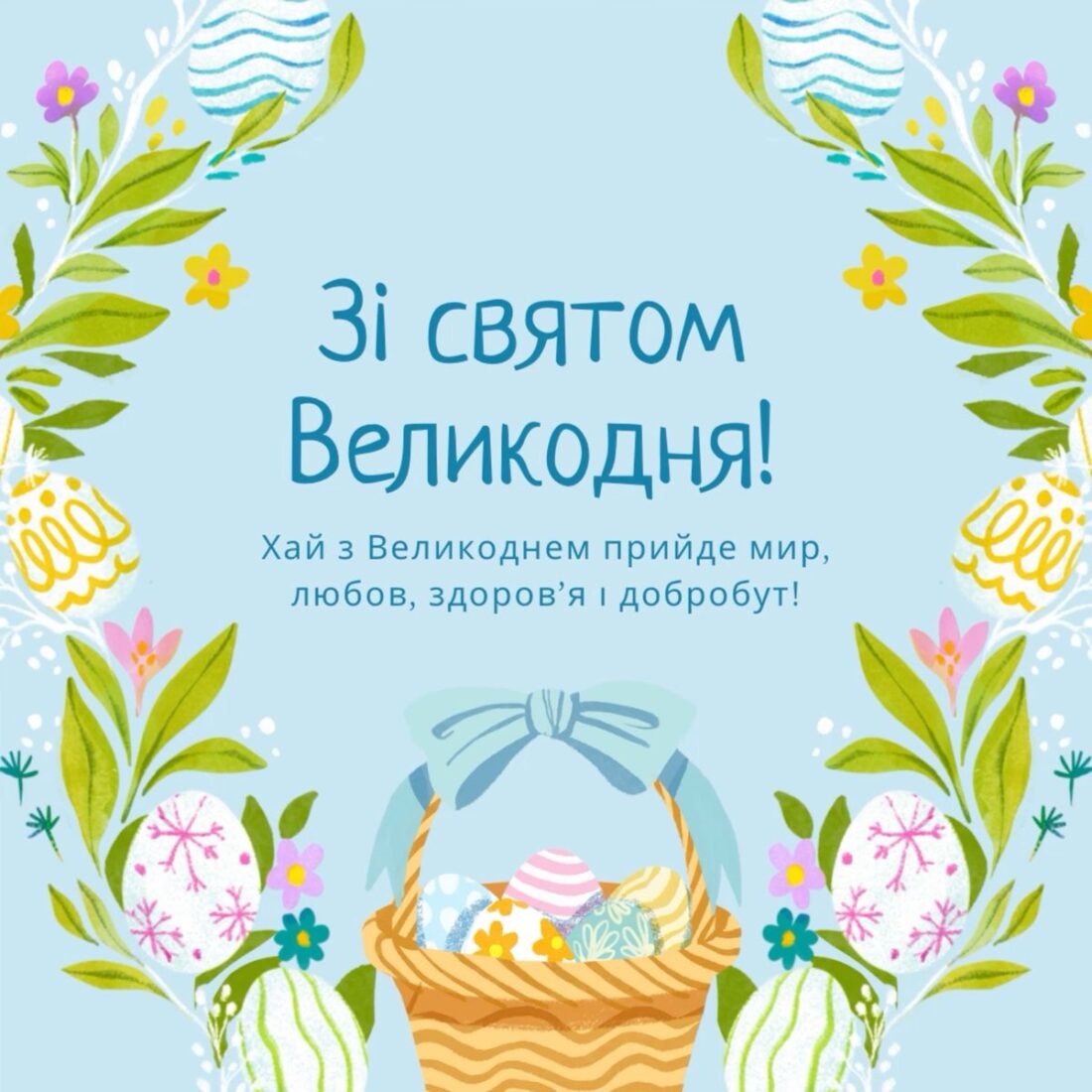 Зі світлим Великоднем! Хай свято подарує спокій та радість. Нехай всі рідні зберуться за святковим столом та у теплому сімейному колі обміняються щирими обіймами та великодніми цілунками.