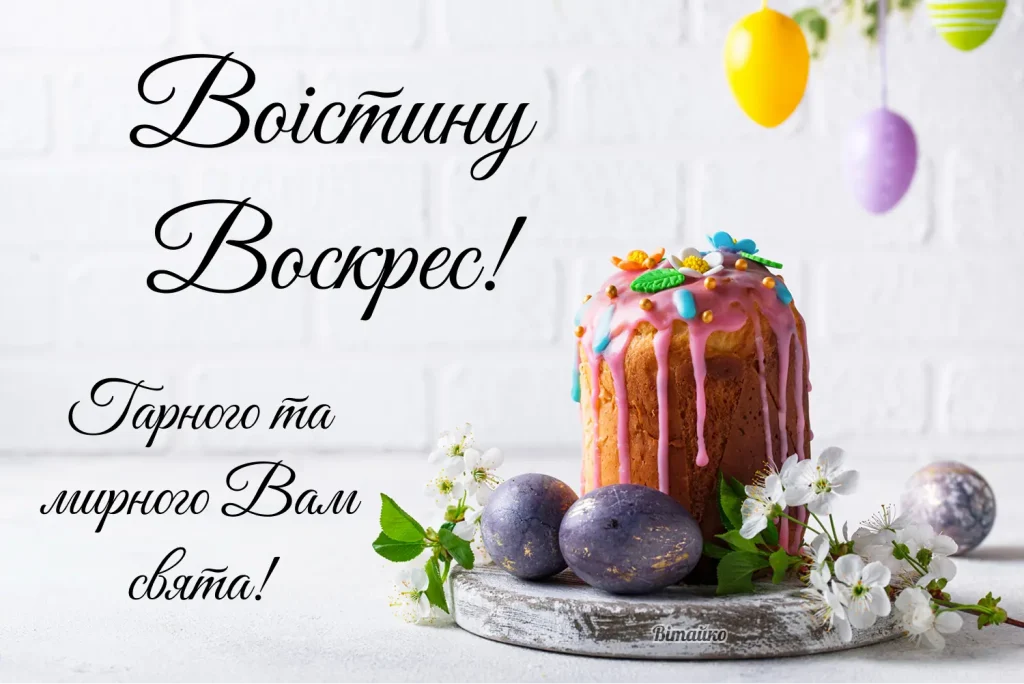 Вітаю тебе зі світлим святом Воскресіння Христового! Нехай частинка тієї радості, яку сьогодні переживає весь християнський світ, залишиться з тобою на весь рік і підтримує тебе у важку годину! Христос Воскрес!