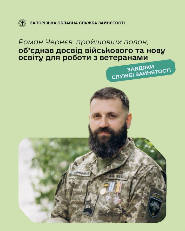 У цивільному житті Роман Чернєв об’єднав досвід військового та нову освіту для роботи з ветеранами. Як йому це вдалося — історію Романа розповіли на сторінці Запорізької обласної служби зайнятості.