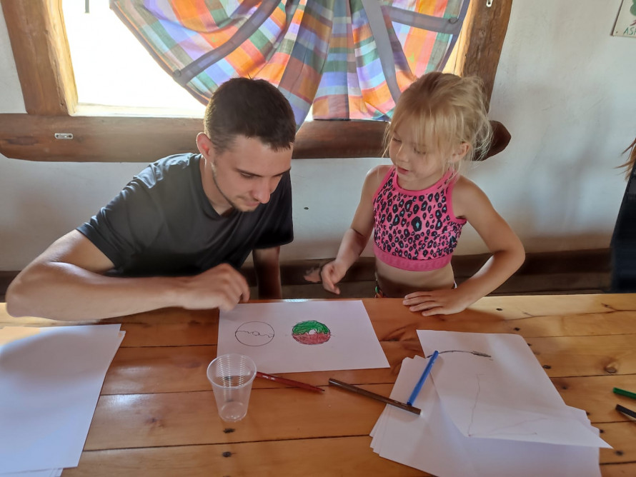 «Діти — це постійне натхнення: їм що не запропонуй, вони все роблять весело та завзято. Скільки цікавих поробок і яскравих малюнків вони забрали додому! А Ірина, бувало, в другому заїзді ділила команди на «діти» та «дорослі»: було весело, дружньо, по-сімейному», — каже Дмитро.