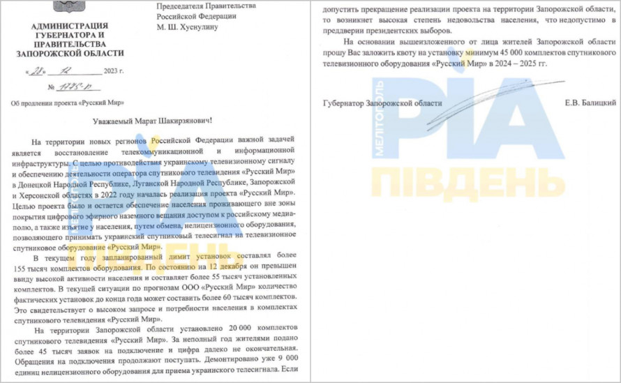 У розпорядженні редакції «РІА Південь», як повідомляється, є лист Євгена Балицького до заступника голови уряду рф Марата Хуснулліна. У цьому документі він просить передати на окуповану територію 45 тисяч комплектів такого обладнання.