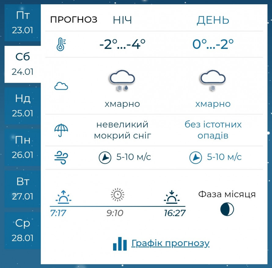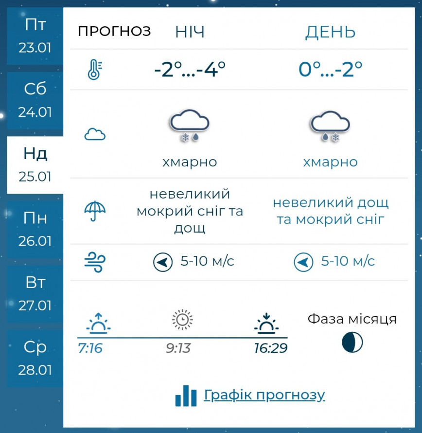 У неділю, 25 січня, погода залишатиметься похмурою. Вночі та вранці без опадів, а вдень йтиме дрібний сніг, який поступово припиниться до вечора. Можливий мокрий сніг і навіть дощ. Температура повітря вночі -2…-4 °C, удень — близько 0…-2 °C. Вітер східний, 5–10 м/с.
