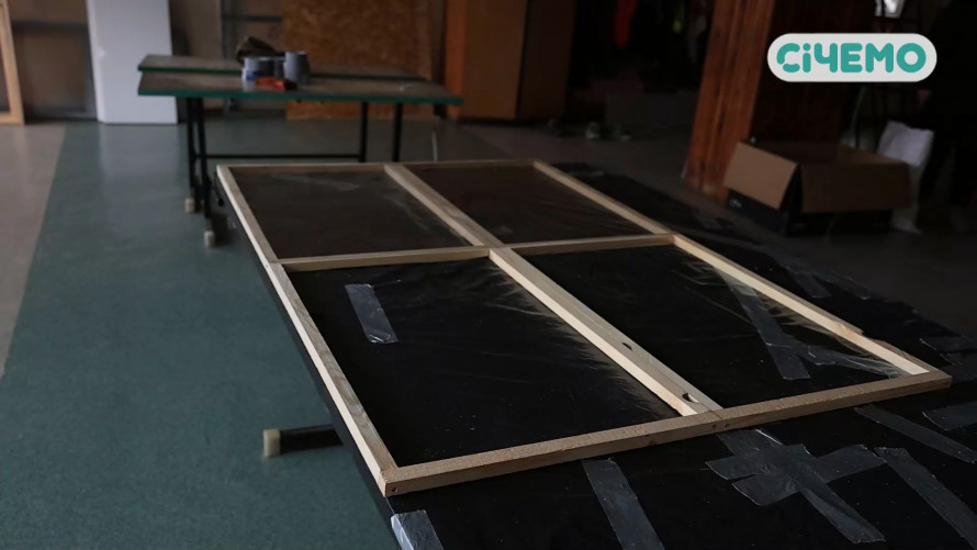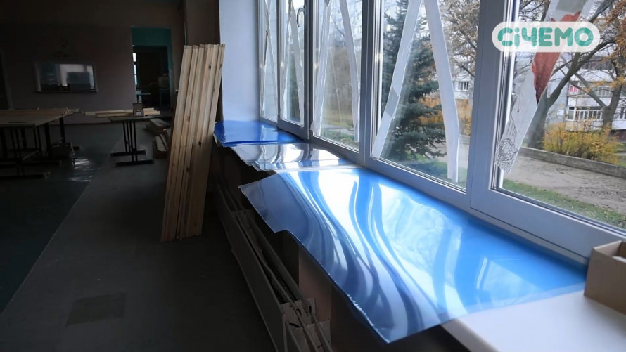 Тимчасову майстерню облаштували прямо у шкільній їдальні. Там збирають дерев’яні конструкції, натягують плівку та готують все необхідне для подальшого монтажу у класах.